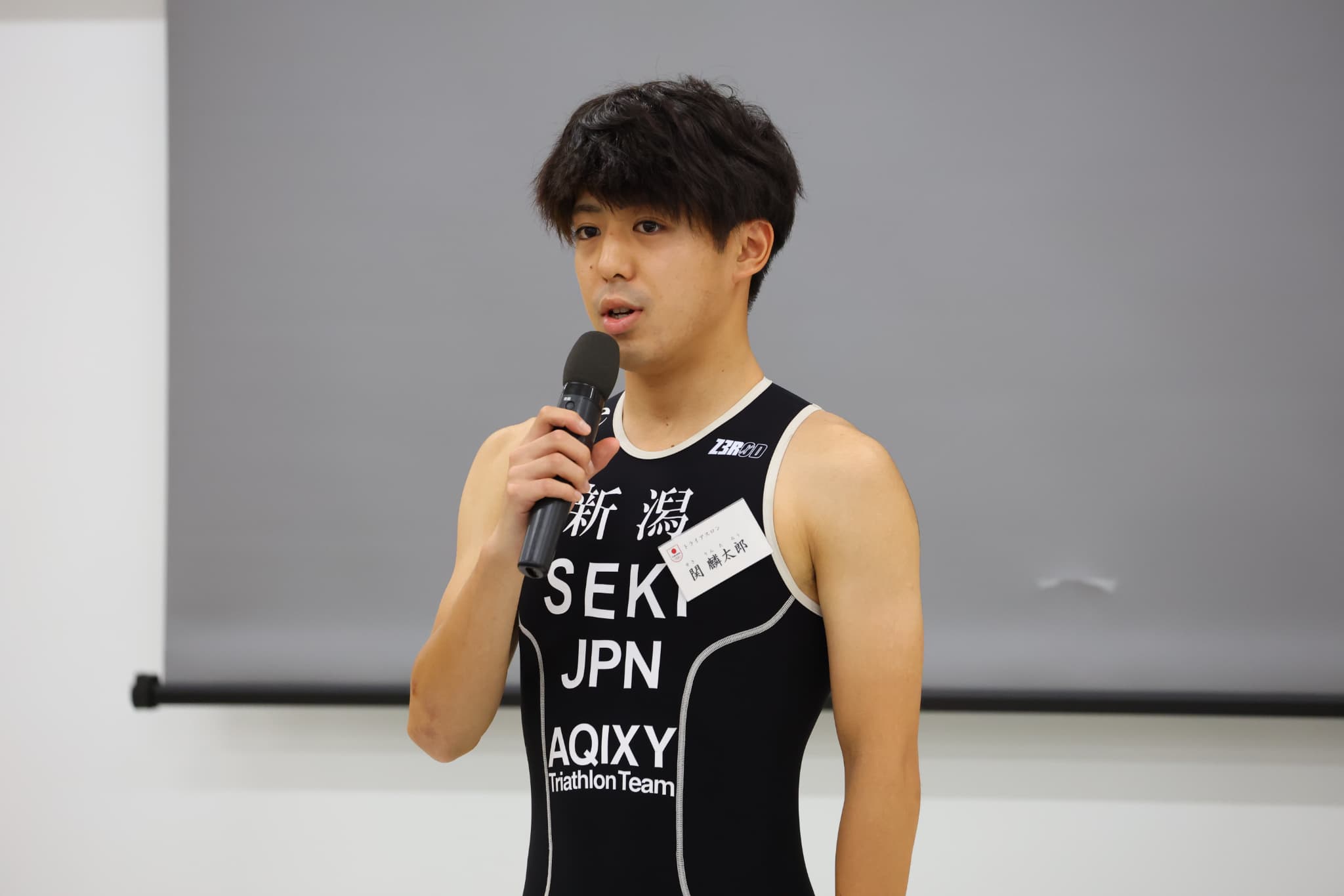 「私は小学4年生の時にトライアスロンを始め、オリンピック出場を目標に競技を続けてきました。大学進学の際には、スポーツバイオメカニクスを学び、競技に活かしたいと考え、その研究で有名な新潟大学に進学しました。しかし、新潟大学にはトライアスロン部はなく、周りに同じ目標を掲げて練習ができる選手もいませんでした。しかし、そのような環境だからこそ培えた強みがあります。それは主体的な行動力です。私は新潟大学進学の際に一人暮らしを始め、練習や生活の環境も一変しました。そこで、よい練習環境を作るため、知り合いのつてを頼って水泳や自転車のチームに入ったり、大学の水泳部と自転車競技部を兼部したり、県の競技連盟の方に直接指導をお願いしたりするなどして質の高い練習ができるように行動してきました。また、トライアスロンのレースに出た際には、参加選手に声をかけ、多くの方と縁を作ることができました。さらに、長期休みの際には知り合った選手に連絡を入れ、様々なチームや選手のもとへ泊まり込みで練習に行きました。学業の面では、スポーツバイオメカニクスはもちろんのこと、スポーツ心理学や生体医工学、栄養学などを主体的に受講し、競技に活かすことができる多くの知識を得ることができました。中でもスポーツ心理学で学んだ『動機づけ』については、自分だけでなく競技部の部長として部員やチームメイトたちと共有することで、チーム全体の士気が向上しました。大学での勉学を通じて、スポーツ、強いてはトライアスロンの奥深さに気付くこともできました。そしてより一層トライアスロンが好きになりました。このように競技活動と学業を通じて、主体的な行動力を培うことができ、昨年は日本学生トライアスロン選手権で優勝を手にすることもできました。私の夢の1つはオリンピック出場とメダル獲得ですが、競技で得たことを一社会人・関麟太郎として社会に還元すること、それが2つ目の夢です。就職後は、この2つの夢を叶えるためにギアを一段階上げて努力を続けます。ご採用いただけましたら、主体的な行動力を活かして、成果をもたらすことができるまで諦めずに努力し、業務を遂行していきます。また、社員の皆さまともコミュニケーションを密に取り、職場環境の士気向上に貢献したいとも考えています。また、選手として競技で結果を出すだけでなく、レースや私生活での礼儀や態度からも企業の知名度アップに貢献できるよう努めていきます。社員アスリートとして会社や地域の方々に勇気を与え、応援される選手を目指しています」