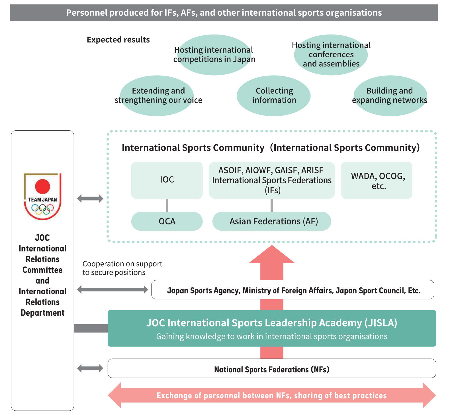 The academy is a human resource development programme that aims to support domestic sports organisations in strengthening their relationship with international sports organisations so as to enhance the international capabilities of their human resources. The programme aims to develop human resources who can represent their domestic sports organisations in the policy-making process of international sports organisations, who can play an active role in international negotiations, and who can pursue international cooperation and contributions.