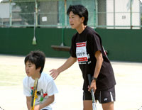 兼城悦子さんのテニス教室で真剣なまなざし。