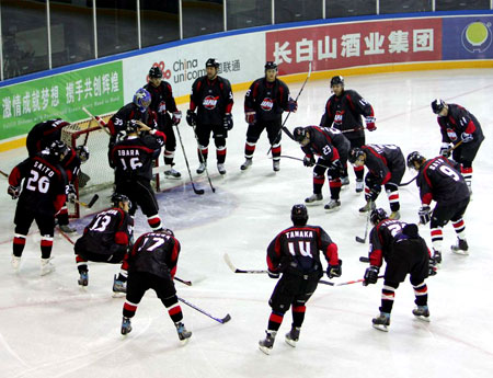 アイスホッケー男子 予選ラウンド 円陣を組む日本代表チーム