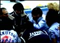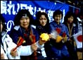 会場の中でひときわ目立っていたのが、赤い裃姿のおじいさん。選手に「フレー、フレー、ニッポン」と元気に応援していました。そのおじいさんは、カーリングの街として有名な北海道常呂町(男女カーリングチーム10人中6人の選手が常呂町出身)の郵便局長。赤い裃は「日の丸のイメージ」なんだそうです。