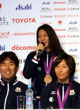 ロンドンオリンピックで戦後最多となるメダル11個(銀3、銅8)を獲得した競泳の日本代表選手団が5日、ロンドン中心部のジャパンハウスで記者会見を行い、メダル獲得の心境を語りました。会見には萩野公介選手、寺川綾選手、鈴木聡美選手、入江陵介選手、松田丈志選手、星奈津美選手、立石諒選手、上田春佳選手、加藤ゆか選手、藤井拓郎選手、北島康介選手のメダリスト11名と平井伯昌コーチが出席しました。