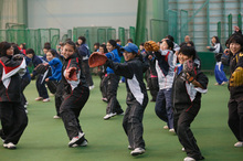 ソフトボール教室は、3チーム対抗形式でのウォーミングアップから始まり、明るいかけ声にあふれ、ハイタッチなどのふれあいが見られる教室となっていました。