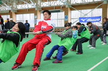 スポーツプログラムとして、しっぽとり競争、ゲートボール、綱引きの3種目が行われ、清水さんはグリーン、須佐さんがレッド、上田さんがブルーのチームリーダーとして子どもたちをとりまとめ、大井さんは応援団長として参加しました。