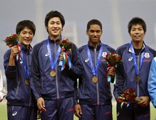 陸上競技男子4×100mリレーで優勝した4選手。左から山縣亮太選手、飯塚翔太選手、ケンブリッジ飛鳥選手、大戸一馬選手(写真:AP/アフロ)