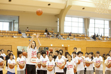 バスケットボール教室では、冒頭に永田さんが基礎の重要性について語り、手首を柔らかくすることを意識しながら基本のドリブルをレクチャー。続いてレイアップシュートの基礎について実践練習を行いました。