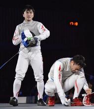 男子フルーレ決勝で藤野大樹(右)を破り、2連覇を果たした千田健太=大田区総合体育館(共同)