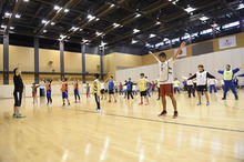 開会式が終わると、クロストレーニングプログラムがスタート。まず共用コートで、エアロビクスでのウォーミングアップを行いました。しっかりと体をほぐして温めたところで、小学生と中学生に分かれ、共用コートでは陸上トレーニング講座、ハンドボール場ではストレッチング・エクササイズとコーディネーショントレーニングが行われました。