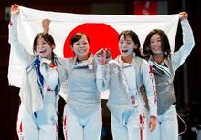 フェンシングの女子フルーレ団体で日本(東、宮脇、菊池、辻)は決勝で中国に35―34で勝ち、初の金メダルを獲得した。初戦の準々決勝でレバノンを退け、準決勝で6連覇を狙った韓国を45―36で破った。 男子サーブル団体で日本(吉田、徳南、島村、ストリーツ)は初戦の準々決勝で中国に24―45で敗れた。(共同)