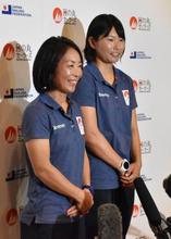 東京五輪に向け、意気込みを語るセーリング女子470級の吉田(左)、吉岡組=12日午後、東京都内(共同)
